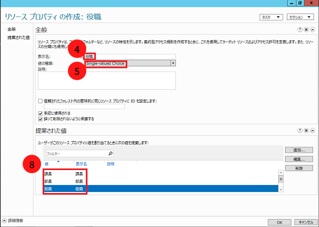 リソースプロパティとは属性の具体的な設定値を指します。今回は役職に「役員」「課長」「部長」を設定します。