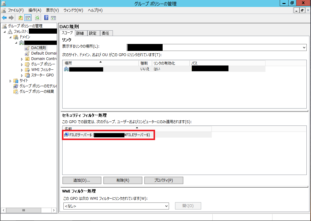 Authenticated Usersの削除が完了したら、ファイルサーバーをセキュリティフィルターに追加します。