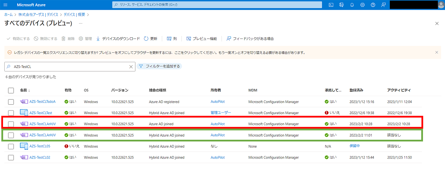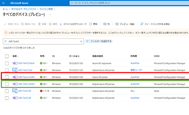 赤枠のデバイスでは結合の種類が「Azure AD Joined」、緑四角のデバイスは「Hybrid Azure AD Joined」と表示されています。