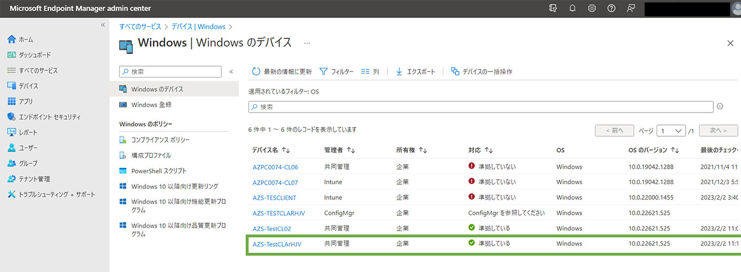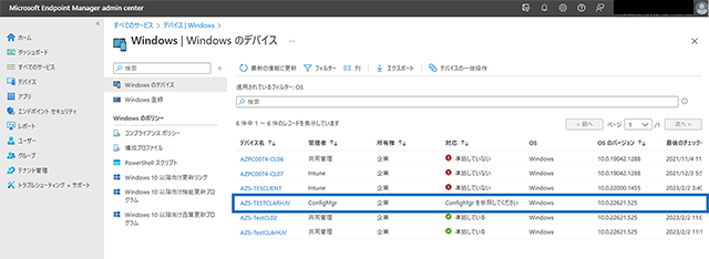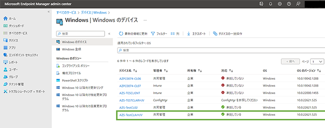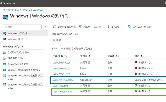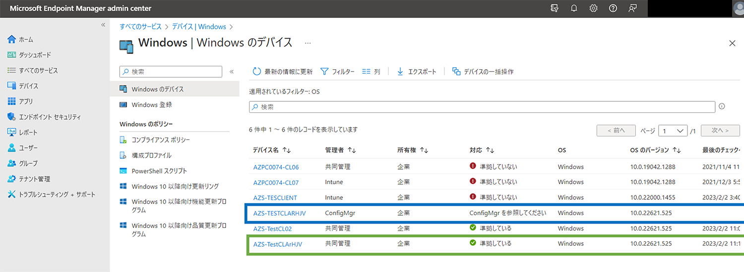 青枠のデバイスは管理者が「ConfigMgr(MECM)」、緑四角のデバイスは「共同管理」と表示されています。