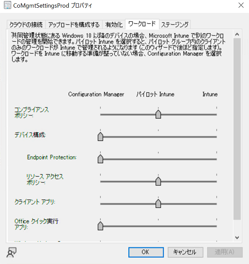ワークロード画面で、各管理項目ごとに機能をIntuneとMCMどちらに寄せるかを設定できます。