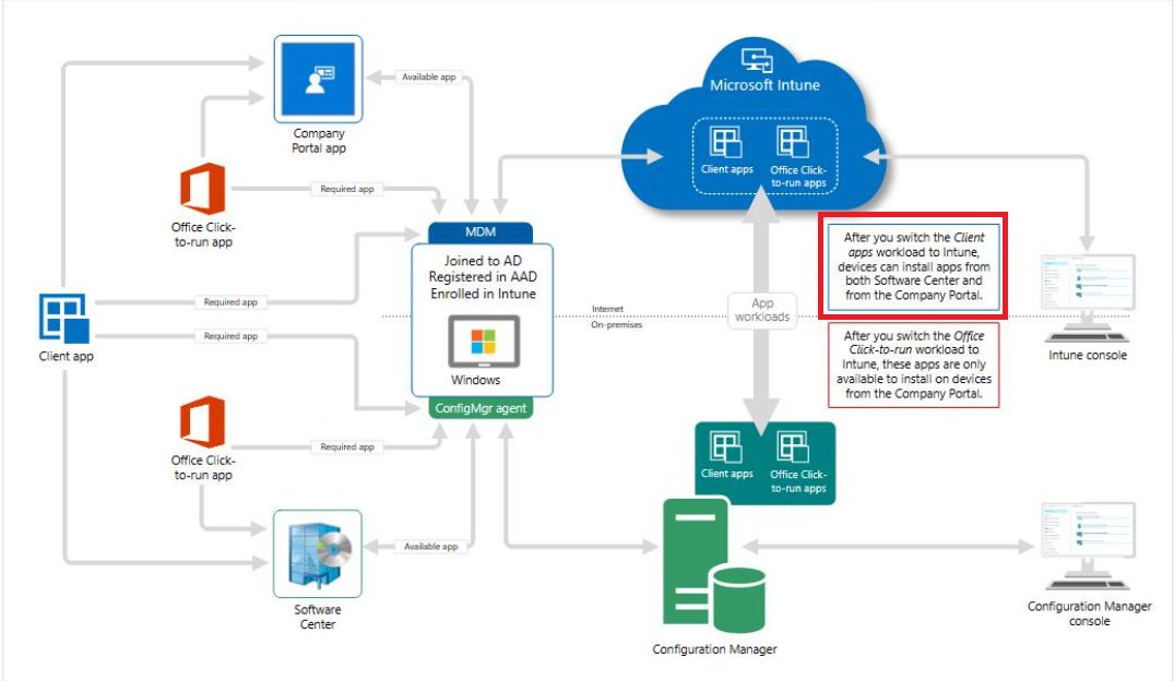 この設定を行うことで社内ネットワークの端末も社外ネットワーク端末も同時に管理が可能な上、一部機能については管理項目のワークロードを指定することでMCMとIntuneのどちらのサービスで管理するかを選択することができます。
