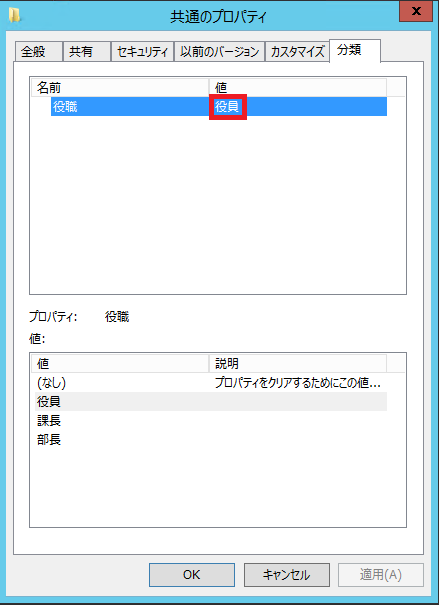フォルダをダイナミックアクセス制御の対象に指定するために分類を指定します。
