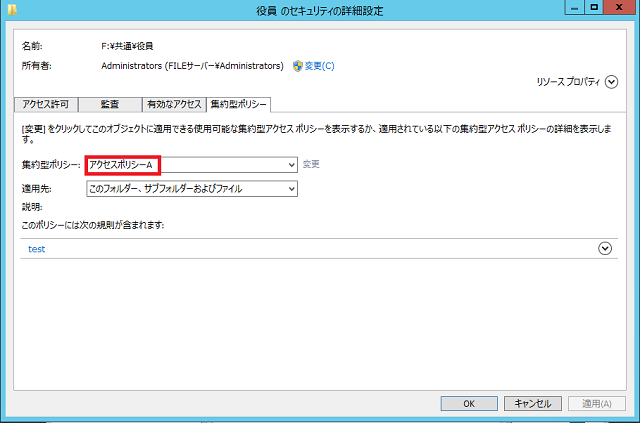 [集約型アクセスポリシー]タブ > [変更] > 作成した集約型アクセスポリシーをドロップダウンリストより選択 > [適用]