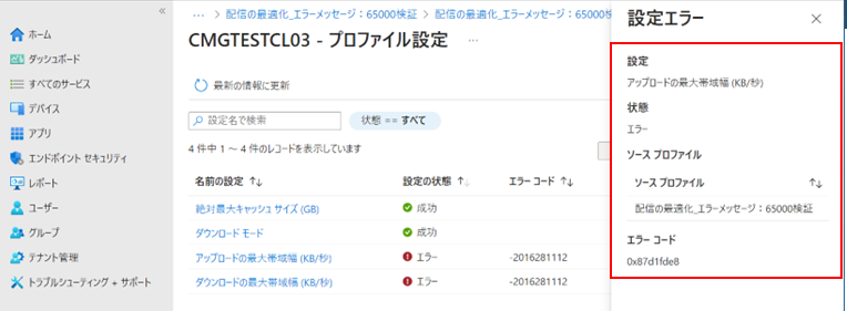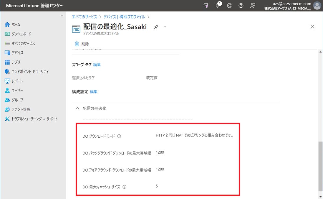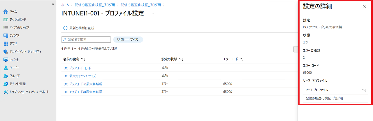 今回エラーが発生したのは、Intuenポータルの左側のメニューから[デバイス] > [構成プロファイル]にて以下の配信の最適化設定を行った際に発生しました。