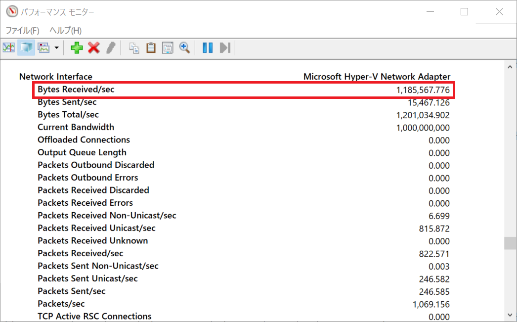 今回は帯域の使用状況を確認したいため、パフォーマンスモニターのデータスケールセットを使用しています。その中でも通信量の確認が行える [Network Interface] より [Bytes Recived/sec] の値を確認します。