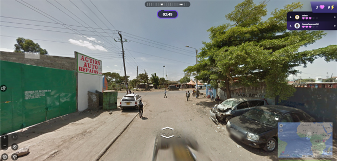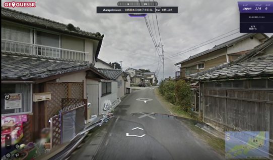 ① ランダムに表示されたストリートビュー内の周りを見回したり、移動したりしながらヒントを探します。
