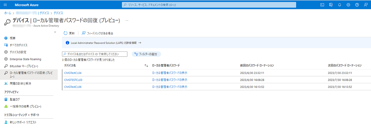 1. ホーム > デバイス > デバイス > ローカル管理者パスワードの回復(プレビュー) で、LAPSが有効なすべてのデバイスを表示します。
