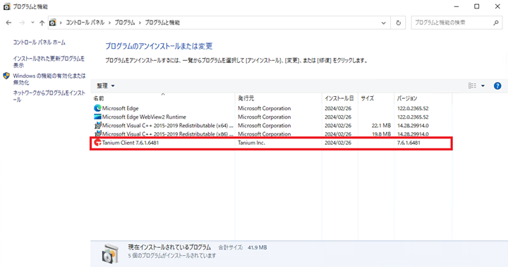 MCMで展開後、クライアントPCのコントロールパネルのプログラムと機能の一覧に「Tanium Client」が表示されていればインストール完了です。