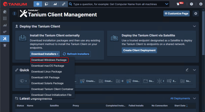 ▼Taniumのコンソール上で「Shared Service」→「Client Management」→「Download Installers」→「Download Windows Package」