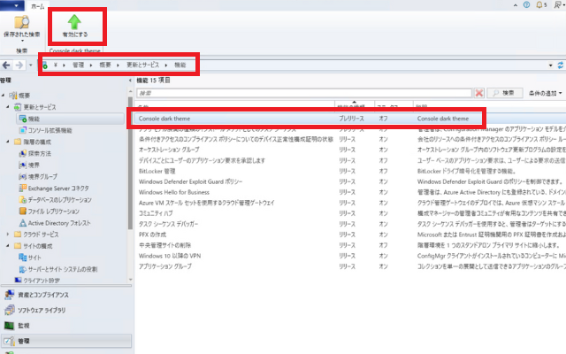 ▼管理 > 概要 > 更新とサービス > 機能 のパスに移動し、[Console dark theme]を選択、リボンから[有効にする]を押下します。