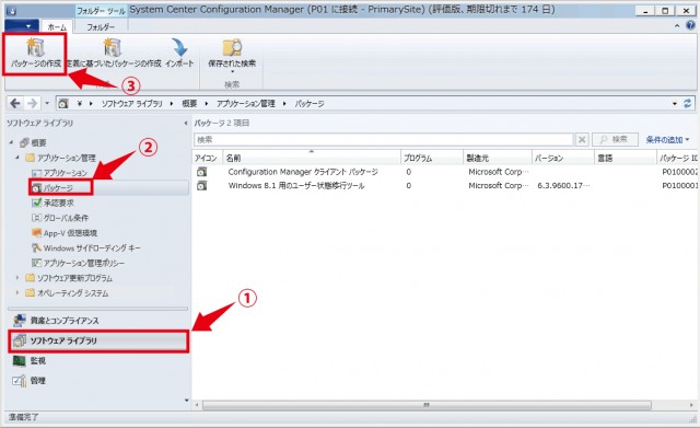 ▼SCCM管理コンソールを起動するとSCCM画面が表示されます。画面①ソフトウェアライブラリを選択します。概要>アプリケーション管理>パッケージを選択します。パッケージを選択すると画面上部のリボンに③のパッケージの作成が表示されますのでパッケージの作成をクリックします。