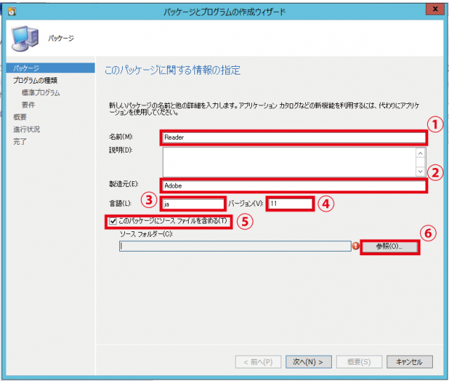 続いて⑤のこのパッケージソースファイルを含めるにチェックを入れます。チェックを入れるとグレーアウトしているソースフォルダがクリックできます。⑥の参照をクリックします。