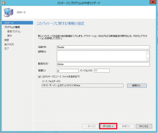 ▼再びパッケージ情報画面に戻るのでソースフォルダのパスが正しいかどうか確認し次へをクリックします。