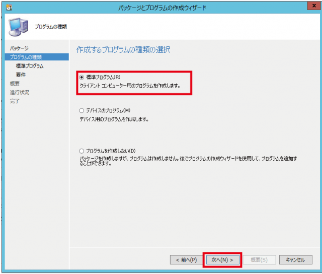▼プログラムの作成ウィザードが表示されるので①の標準プログラムにチェックが入っていることを確認して次へをクリックします。