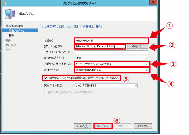 - ②コマンドライン:コマンドラインを入力します。このコマンドライン入力欄にはいろいろなコマンドを入力することができます。例えばユーザ操作させることなくインストールさせたい場合はサイレントインストールコマンドが有効です。Adobe Reader 11のインストーラーは画面のようなサイレントコマンドを入力することでユーザ操作させることなくインストールすることができます。今回はAdobe Reader 11のサイレントコマンドなので/sAll /rsと入力します。