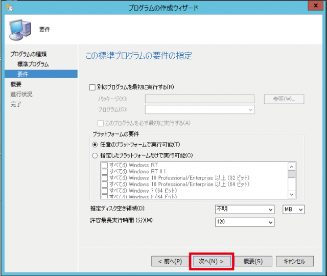 ここではインストールさせたいPCのプラットフォームやディスク容量や実行許容時間などを入力します。ここの設定は必須ではないのでそのまま次へをクリックします。