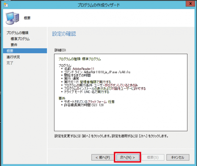 ▼設定確認画面が表示されますので確認して次へをクリックします。