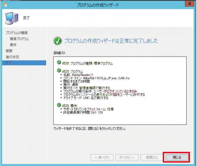 ▼プログラムが作成が実行されウィザードが正しく実行されたら閉じるをクリックします。