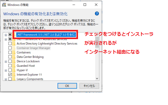 .NET Framework 3.5 はGUIベースでインストールするのですが、オフラインインストールが無くなり、インターネット経由でインストールさせる仕組みになっています。