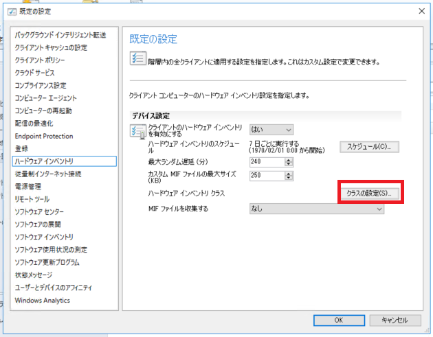 ②SCCMサーバーのクライアント設定からハードウェアインベントリーを選択