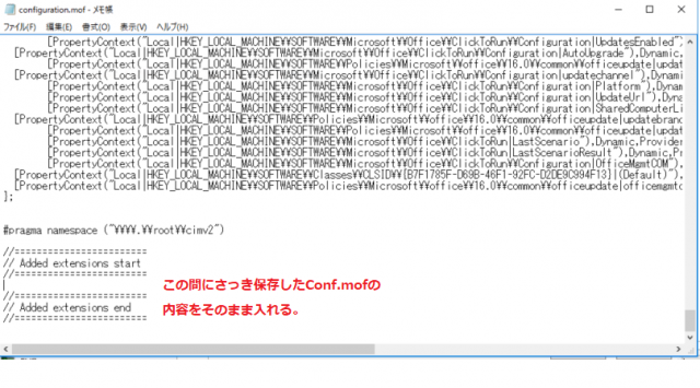 というコメントの箇所に、保存したConf.mofの内容をそのまま貼り付けます。