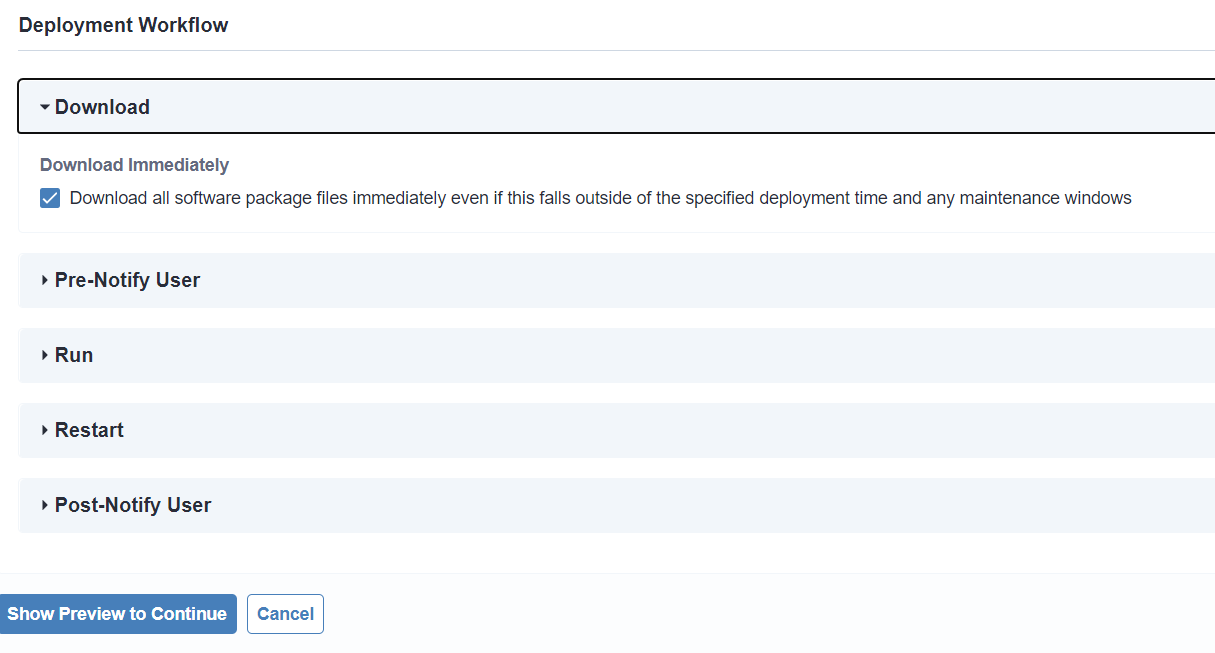 10.設定完了後、デプロイと同様「Show Preview to continue」をクリックしてソフトウェアの展開プレビューを実行します。