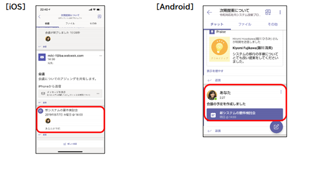 ▼会議の予定が予定表に追加され、チームの投稿欄にも会議についての予定が投稿される。