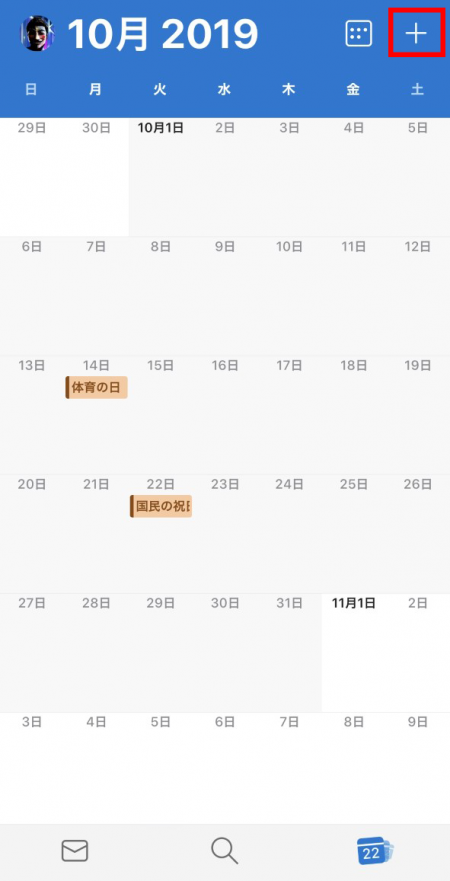 ▼まず「予定表」を選択する。そして、右上の赤四角で囲まれたアイコンをタップ。
