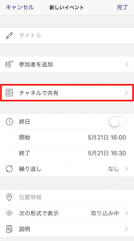 ▼赤の四角で囲まれた部分をタッチした後に、会議を行いたいチャンネルを選ぶ。