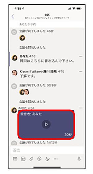 ▼録画された内容は、チャネルに投稿された会議のスレッド内、またはチャットに表示されている会議内に投稿される。