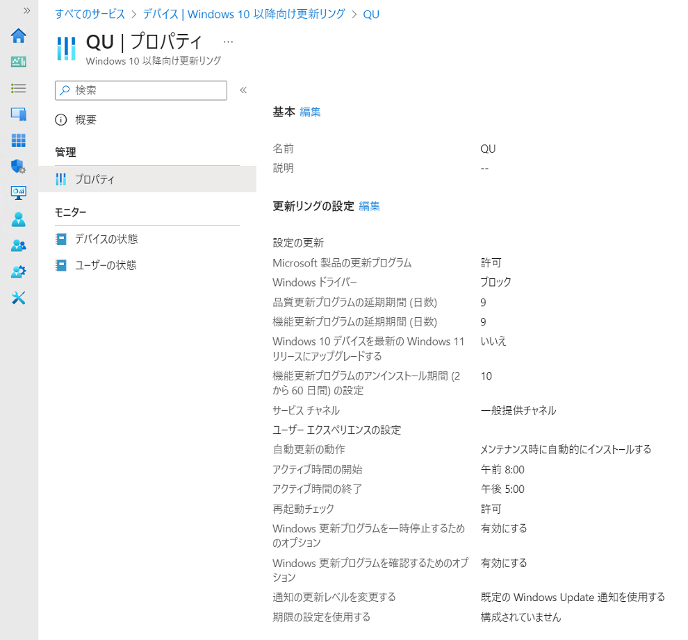 Intune管理コンソールの左にある[デバイス] > [Windows10以降向け更新リング]を開き、以下のように選択しました。