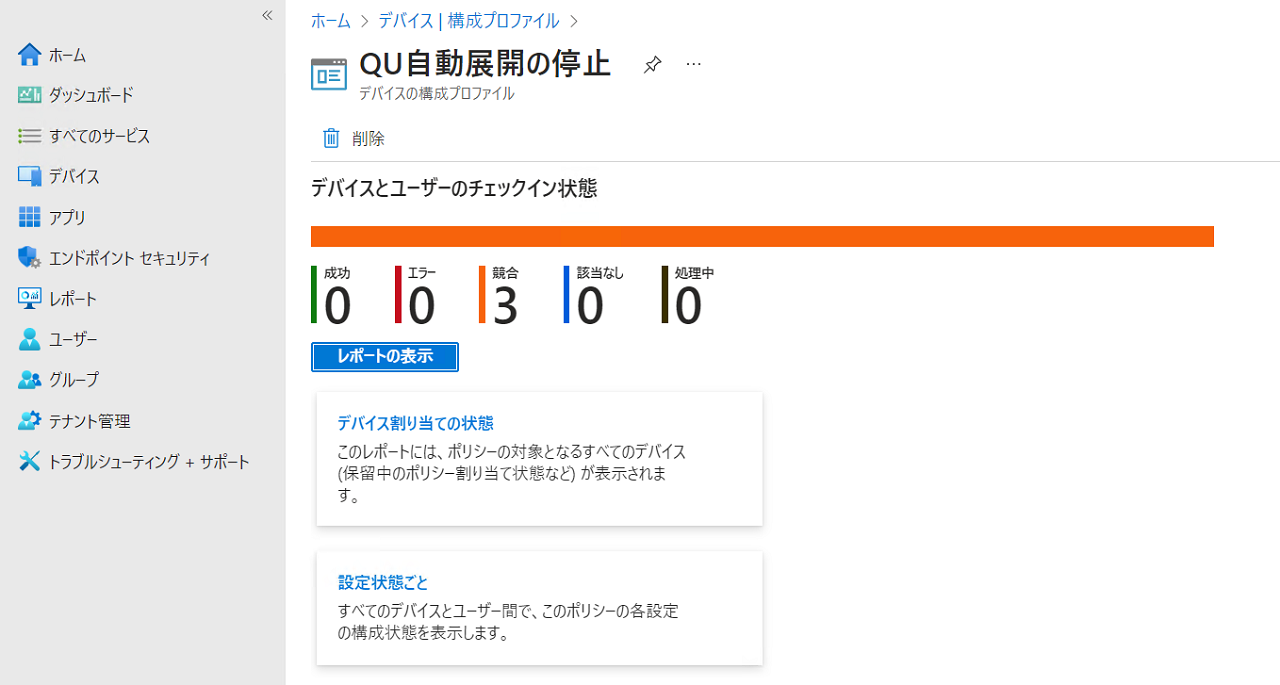 まずはIntune側で再度ステータスが競合になっているかを確認しました。