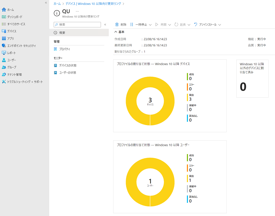 こちらは前の検証同様に、自動更新無効化のプロファイル、更新リングどちらもステータスが競合になっていました。
