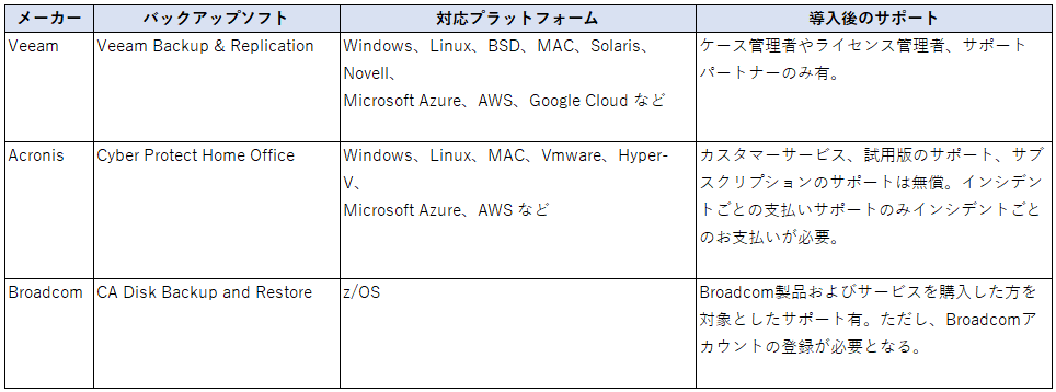 主要なバックアップソフトのメーカーとして「Veeam」「Acronis」「Broadcom」が挙げられます。それぞれの特徴をご紹介します。