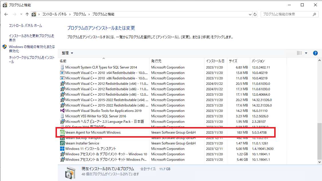 「コントロールパネル」>「プログラム」>「プログラムと機能」を開き、「Veeam Agent for Microsoft Windows」がインストールされていることを確認できたら、正常に機能していると判断して良いと思います。