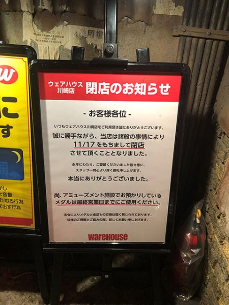 また一つゲームセンターがなくなってしまいます。そうです「ウェアハウス川崎店」です。