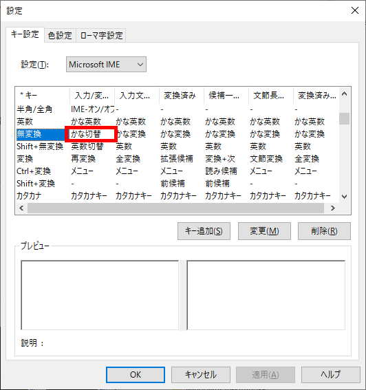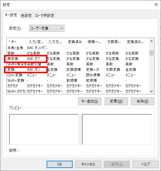 ▼変換の「入力/変換済み文字なし」列を「IME-オン」に変更