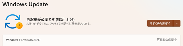 Windows 11 22H2を使用している場合は有効化パッケージでのアップデートとなりますので、短時間で終了します。